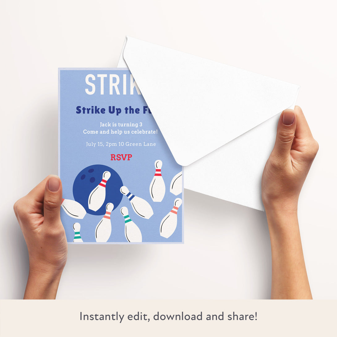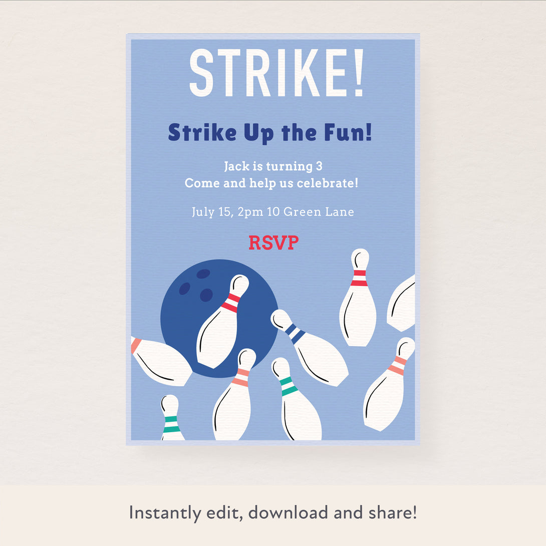 Strike up some fun with these bowling-themed invitations, perfect for sporty parties and pin-tastic celebrations. Simply add the details of your celebration, including the name, date, time and party address, to personalise it and make it truly unique.