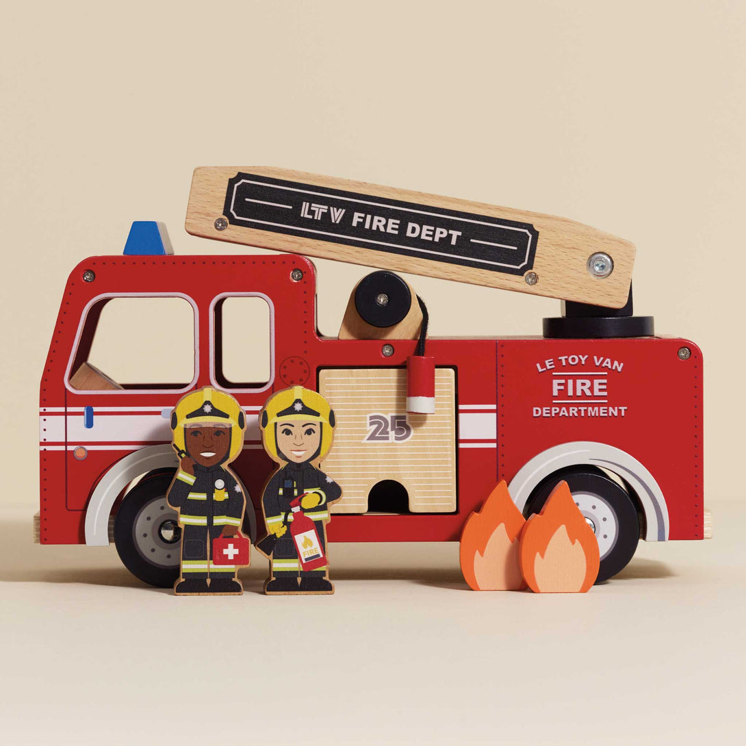 This charming retro red fire engine includes two characters, a rotating and extendable ladder, extendable fire hose, two flames, alongside openable rear and side doors. The roof of the fire engine is removable, allowing children to access the steering wheel and take control of the rescue operations.